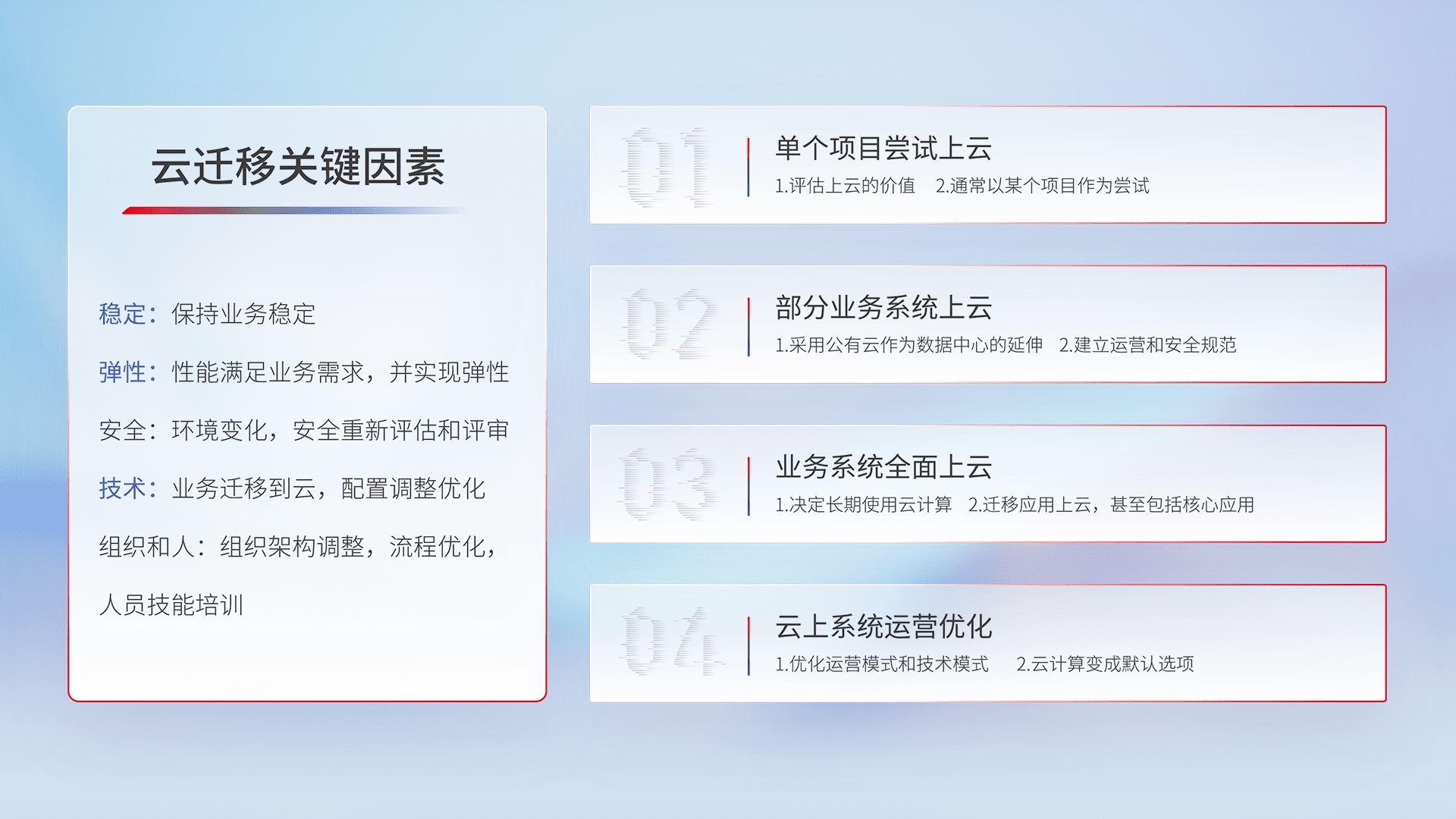 结合实际业务,,,,从规划设计、、、、云平台选型、、云原生改造、、、、数据迁移、、集成交付,,,迁移全过程为客户识别最佳上云路径,,,,做好风险识别管理,,,,设计网络架构、、、、身份权限、、、、安全审计合规、、、、操作审计、、、日志审计、、、监控告警策略、、多站点容灾设计等,,对云上基础设施进行整体规划,,提升IT治理水平,,,,以满足弹性、、高可用、、高性能的需求。。。