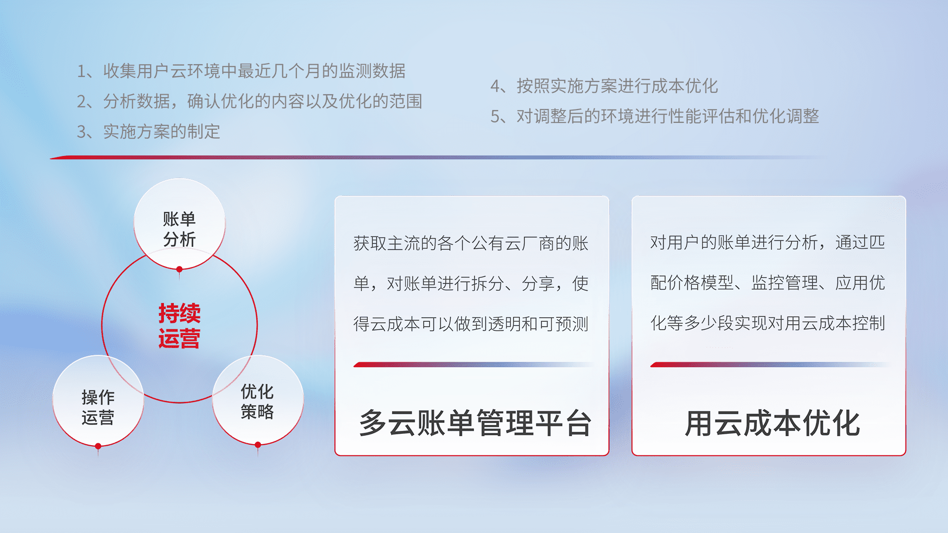 通过多云纳管,,,以统一的资源数据模型把客户的云资源进行抽象和封装,,,,进而实现对多云资源的统一操作,,,,保障云资源管理的可靠性、、、、稳定性与可用性。。。。量身定制化运维内容,,,,配置、、开发运维、、、补丁管理、、备份、、、、监控、、、、认证和访问管理、、审计和日常巡检等,,,保障在用云过程中的可靠度,,,,稳定度以及高可用率。。